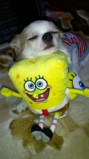 スポボブの縫いぐるみを枕にして寝てるよぉー